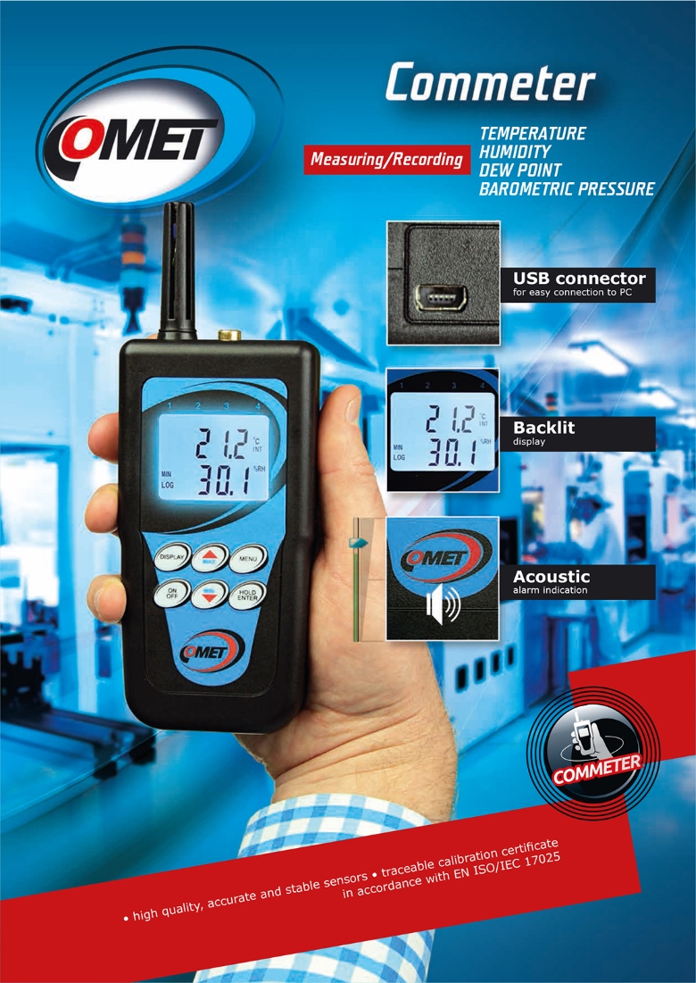 ● Accurate measurement of temperature, humidity, dew point, atmospheric pressure, two-state events, pulses, 4–20 mA, 0–5 V, 0–10 V and CO2 ● Nonvolatile memory ● Audiable and visual indication alarm conditions ● Settings via keypad ● Various communication interfaces - USB, RS232, Ethernet ● Software for data analysis on PC ● Battery operated ● Backlit display
