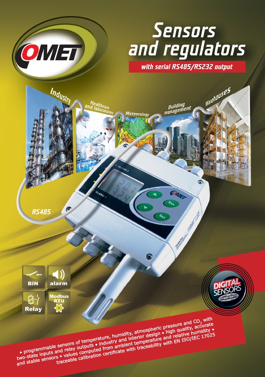● Accurate measurement of temperature, humidity, dew point, atmospheric pressure, two-state events and CO2 ● Various type of output such 4 – 20 mA, 0-10 V, RS232/485, Ethernet (PoE on selected models), Radio (Sigfox)● Industrial design with integrated sensors, external probe and duct mount design (protection class up to IP65) ● Interior design ● ATEX design for potentially explosive atmospheres (zone 2) on selected models ● Relays output 250Vac /8A or 50V on selected models
