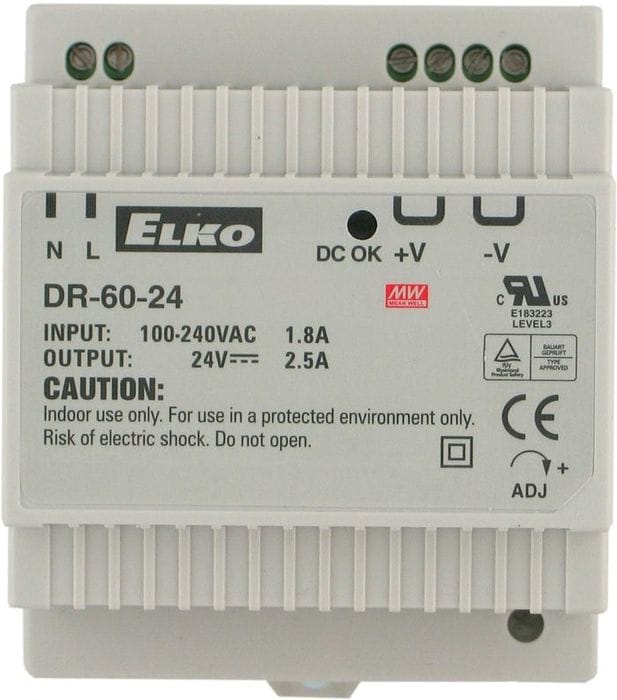 Power supply 230V-50Hz/24Vdc/2,5A for DIN rail 35mm, dual terminals 24Vdc, switch-mode, including DIN rail of 100mm length