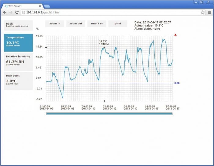 Ambient temperature, relative humidity t-line Web sensor. Remote alarm.