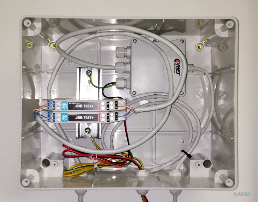 - For recording temperature and humidity, we used an intrinsically safe sensor manufactured by Comet system s.r.o. T3110Ex with built-in temperature and humidity sensor. The sensor shows the measured values on the display and sends the measured data to the converter using the current output 4 - 20 mA. This sensor is ATEX certified and is therefore suitable for this purpose.